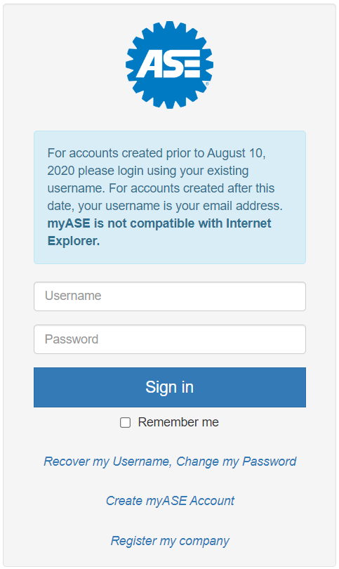 To create an ASE profile, click on the “Create myASE Account” link on the page after selecting myASE in the upper right corner of the ASE portal home page (www.ase.com); provide ASE with your Person ID (not 9-digit GMIN).