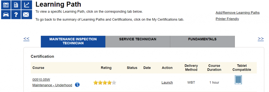 Whether the service technician is trying to meet the STS requirements for training or to achieve MTC, the Learning Path provides the recommended sequence for taking course components in a Certification Area. The order for taking the course components is from the top to the bottom of the Learning Path. Please note that the course is in the recommended learning sequence, but the components are not in the correct completion order.